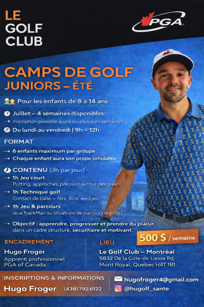 C’est l’option idéale pour les parents qui veulent un camp structuré, encadré, et surtout axé sur la vraie progression au golf.